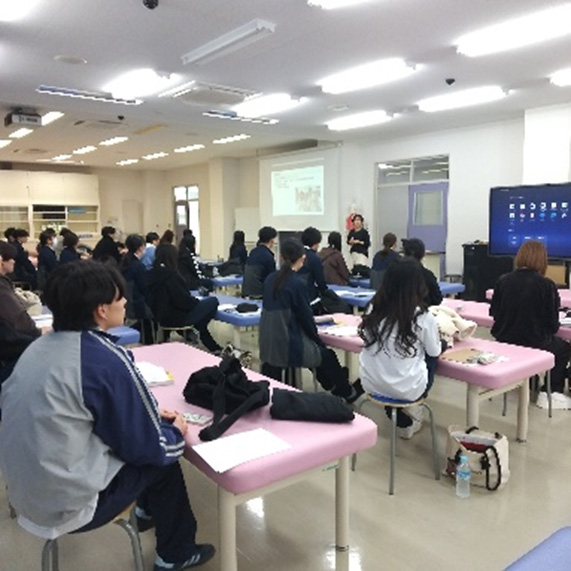 産前の女性はバランスの変化から高齢者同様に転倒し易くなります。また産後は腹壁が伸び骨盤底筋群が弱化するため腰痛・尿漏れに悩まされます。このような身体の変化について解剖学的な知識を学び、実技指導を受けました。講義後の感想では、「女性の健康課題は男性も知ることでお互いサポートすることができる」「女性の体特有の問題にフォーカスを当てた理学療法にとても興味がわきました」「骨盤のアライメントとインナーユニット、呼吸のつながりが学べました」と述べられていました。これからも活躍する先輩をとおして社会における理学療法の重要性と広がりを学んでほしいと思います。
